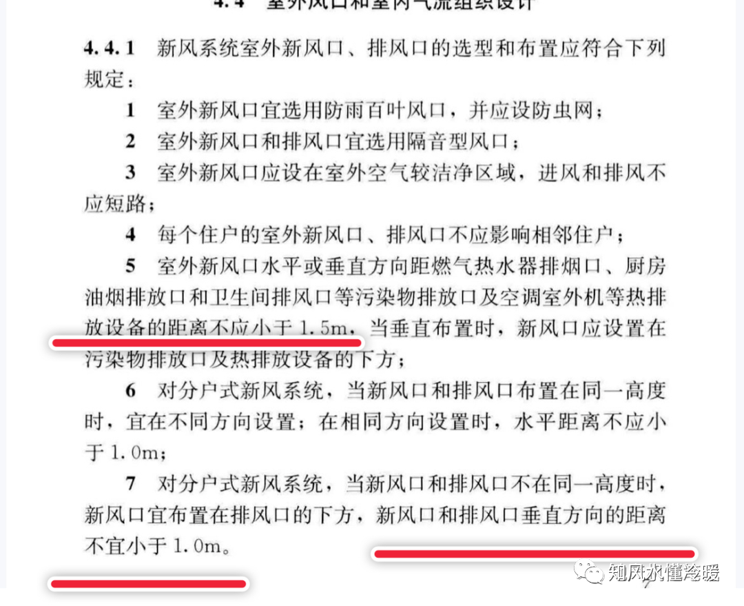 根據(jù)國(guó)標(biāo)住宅新風(fēng)系統(tǒng)技術(shù)標(biāo)準(zhǔn),新風(fēng)進(jìn)風(fēng)口距離新風(fēng)排風(fēng)口和燃?xì)馀艧熆诎踩嚯x應(yīng)大于1.5米以上,當(dāng)垂直上下分布時(shí),新風(fēng)口應(yīng)設(shè)置在污染物排放口及熱排放設(shè)備的下方,安全距離大于1米以上。