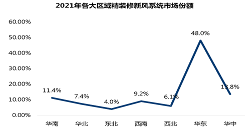 從區(qū)域分布來看,2021年華東是精裝修新風(fēng)系統(tǒng)配套的主力區(qū)域,建議重點深耕一二線市場的核心城市。2021年,我國精裝修新風(fēng)系統(tǒng)配套規(guī)模最高的地區(qū)為華東,市場份額為48%;華南和華中緊隨其后,說明新風(fēng)系統(tǒng)在一二線市場項目中配套較多,比較受開發(fā)商歡迎;2021年,從城市分布來看,南京、無錫、杭州、西安、成都是全國精裝修新風(fēng)系統(tǒng)配套量TOP5的城市,未來隨著都市圈和城市群的推進(jìn),新一線市場仍然是新風(fēng)重點布局的市場。