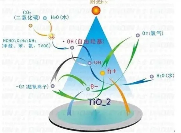 凈化原理:在光源照射下,光觸媒能夠利用特定波長光源的能量產(chǎn)生催化作用(氧化還原反應(yīng)),使周圍的氧氣及水分子激發(fā)成具高活性的自由基,這些自由基,也有說法叫"光等離子體",幾乎可分解所有對人體或環(huán)境有害的有機(jī)物質(zhì)及部分無機(jī)物質(zhì)。(光觸媒,也稱為光催化劑,是一類以二氧化鈦為代表的,在光的照射下自身不起變化,卻可以促進(jìn)化學(xué)反應(yīng),具有催化功能的半導(dǎo)體材料的總稱。)