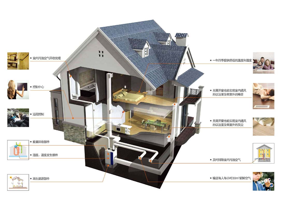 全屋新風(fēng)系統(tǒng)能夠獨(dú)立的進(jìn)行室內(nèi)空氣置換、凈化、流動(dòng)系統(tǒng),在排除室內(nèi)的污染空氣的同時(shí),輸入100%自然新鮮空氣,并將輸入室內(nèi)的新風(fēng)經(jīng)過中效過濾、殺菌、增氧、滅毒、預(yù)熱(室外空氣較冷時(shí))等多項(xiàng)處理后再送入室內(nèi)。家庭全屋新風(fēng)系統(tǒng)的創(chuàng)新點(diǎn)是:用多臺(tái)新風(fēng)機(jī)按空氣流動(dòng)原理,組成“全屋新風(fēng)系統(tǒng)“形成室內(nèi)新風(fēng)流動(dòng)場(chǎng)。系統(tǒng)營(yíng)造的是一種時(shí)刻保持室內(nèi)空氣潔凈、清新的、呼吸無憂無慮的健康室內(nèi)環(huán)境。